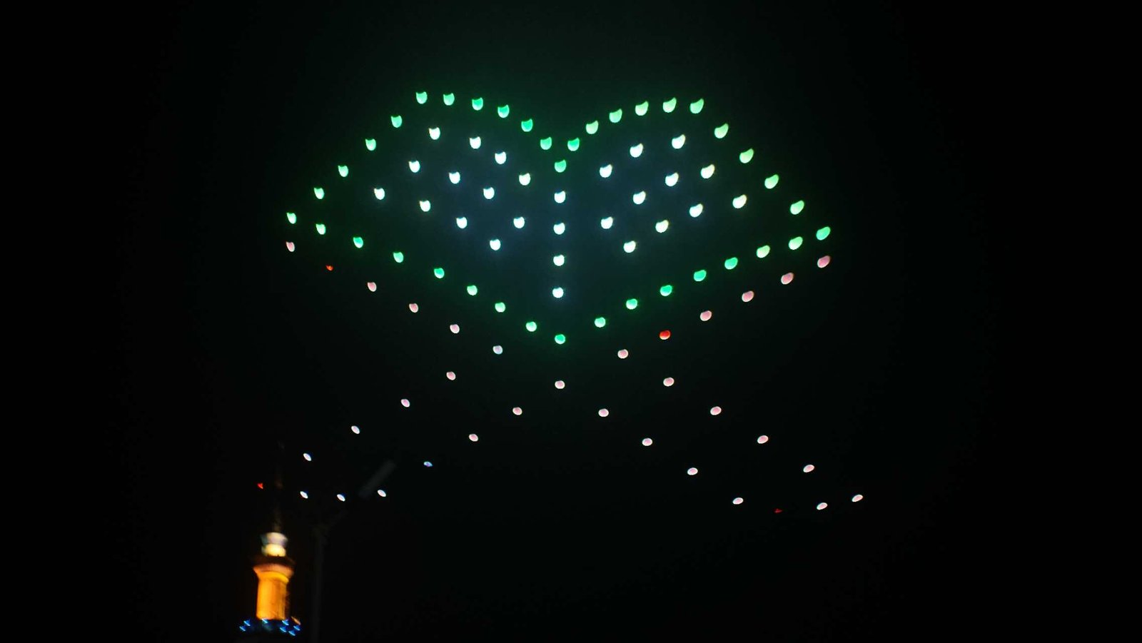 Suasana menjadi khidmat ketika formasi drone membentuk lafadz “Allah” dan “Muhammad”, memancarkan nuansa spiritual yang mendalam di tengah kemegahan teknologi. Tak kalah menarik, ikon Tugu Surabaya ikut dihadirkan sebagai simbol kebanggaan kota pahlawan.